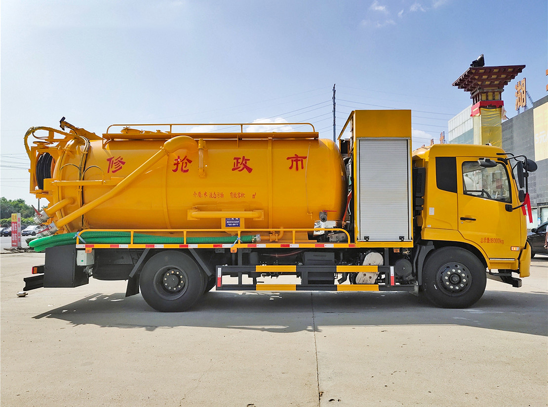 清洗部分:5方水箱,采用8mmQ235優質碳鋼板,水箱兩側消防接口進水,工具箱一個。采用天津通潔250L流量高壓泵,配100米內徑19#高壓管,10個大小不同噴頭一套, 后置式清洗卷盤,帶淋管裝置(用于淋洗高壓管疏通管道過后上面殘留的污物),帶氣吹水功能(用于吹出每次高壓管工作完以后內部殘留的水漬,防止天冷結冰影響下次使用)